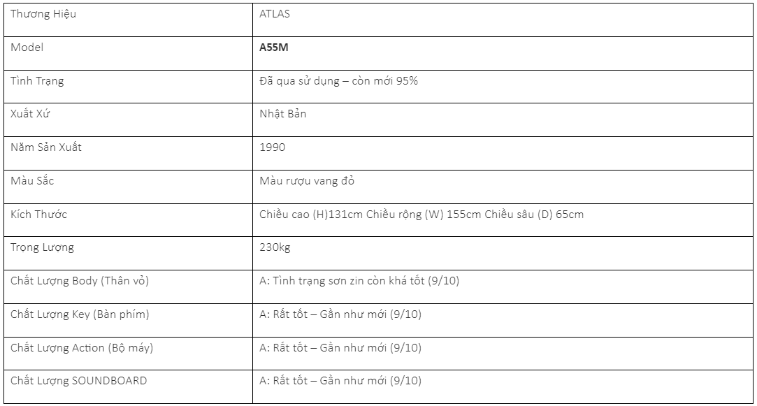 Đàn piano cũ Piano Atlas A55M được sản xuất vào thời kỳ hoàng kim khi các kỹ thuật sản xuất đàn của Atlas đã hoàn thiện. Bên cạnh đó, những loại gỗ cao cấp, chất lượng được nhập khẩu từ Bắc Mỹ trong giai đoạn này cũng rất nhiều. Bởi vậy, model luôn chinh phục giới điệu mộ nhờ chất âm trong trẻo, ấm áp, ngân vang, mạnh mẽ.