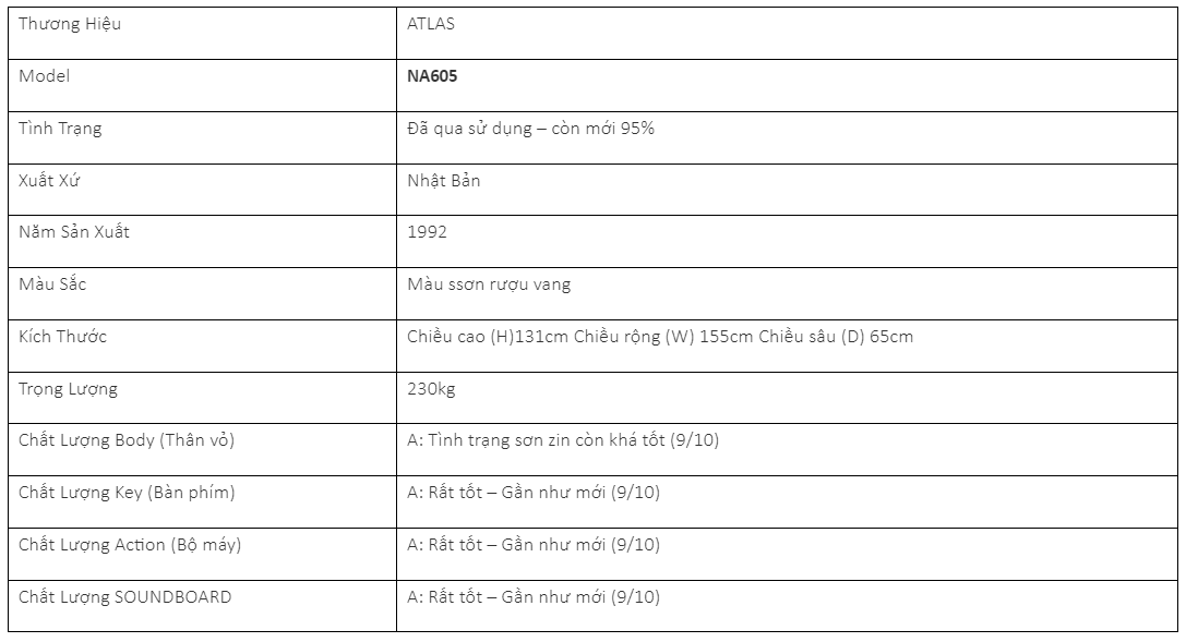 Đàn piano cũ Piano Atlas NA605 được sản xuất vào thời kỳ hoàng kim khi các kỹ thuật sản xuất đàn của Atlas đã hoàn thiện. Bên cạnh đó, những loại gỗ cao cấp, chất lượng được nhập khẩu từ Bắc Mỹ trong giai đoạn này cũng rất nhiều. Bởi vậy, model luôn chinh phục giới điệu mộ nhờ chất âm trong trẻo, ấm áp, ngân vang, mạnh mẽ.