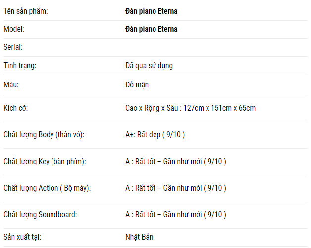 Đàn piano Eterna là hàng nội địa của Nhật, model này được sản xuất vào khoảng tầm năm 1975. Là cây đàn có âm thanh cực tốt với màu sắc đen bóng đẹp mắt. Nếu bạn là người chơi yêu thích thương hiệu đàn Piano Nhật Bản nhưng tài chính hạn hẹp thì piano cũ Eterna xứng đáng là sự lựa chọn lý tưởng dành cho bạn. Các chi tiết cấu thành Eterna được thực hiện tỉ mĩ bởi bàn tay khéo léo của những người thợ thủ công lành nghề. Đặc biệt cây đàn có tuổi thọ lê đến hàng trăm năm nhờ sự kết hợp giữa chất liệu gỗ tự nhiên kết hợp với công nghệ tiên tiến. Vì vậy, Quý khách có thể yên tâm về chất lượng, độ bền của cây đàn.