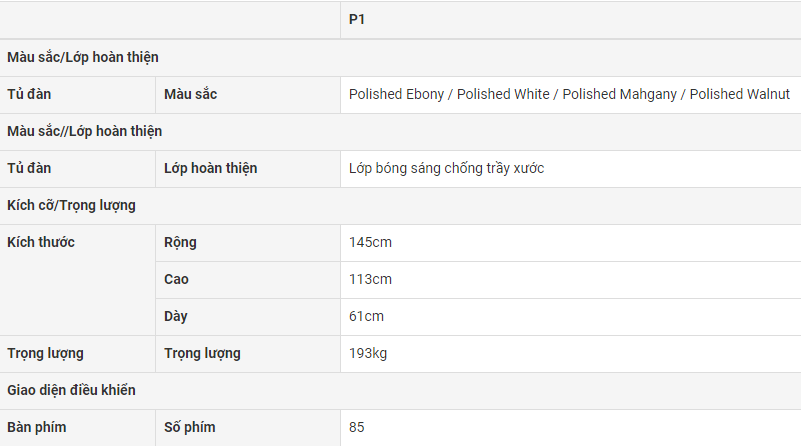 Thông số kỹ thuật đàn Đàn Piano Yamaha P1A: