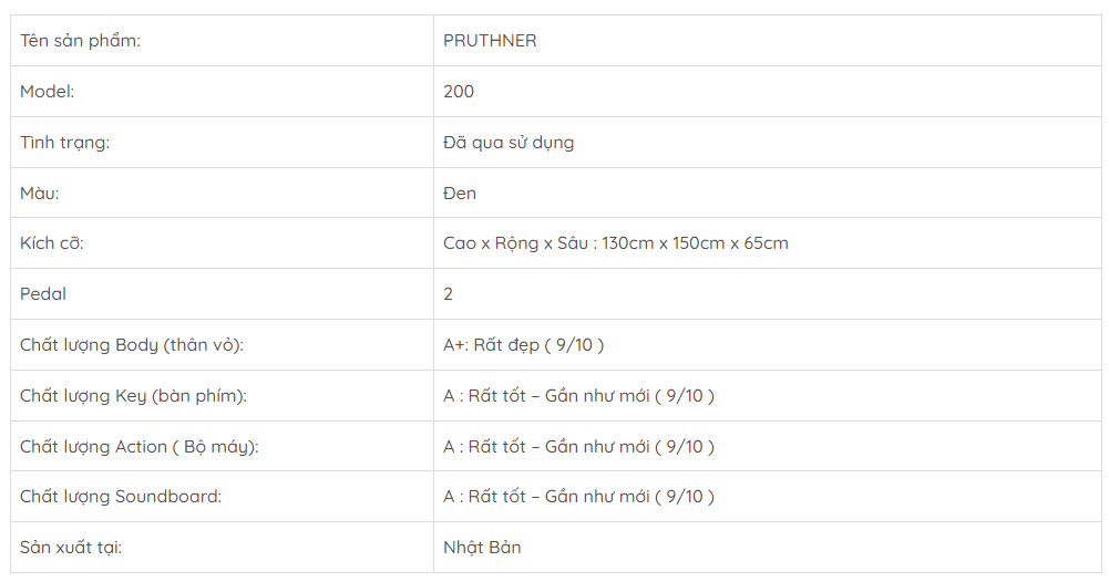 Thông số kỹ thuật đàn Piano Upright Pruthner 200: